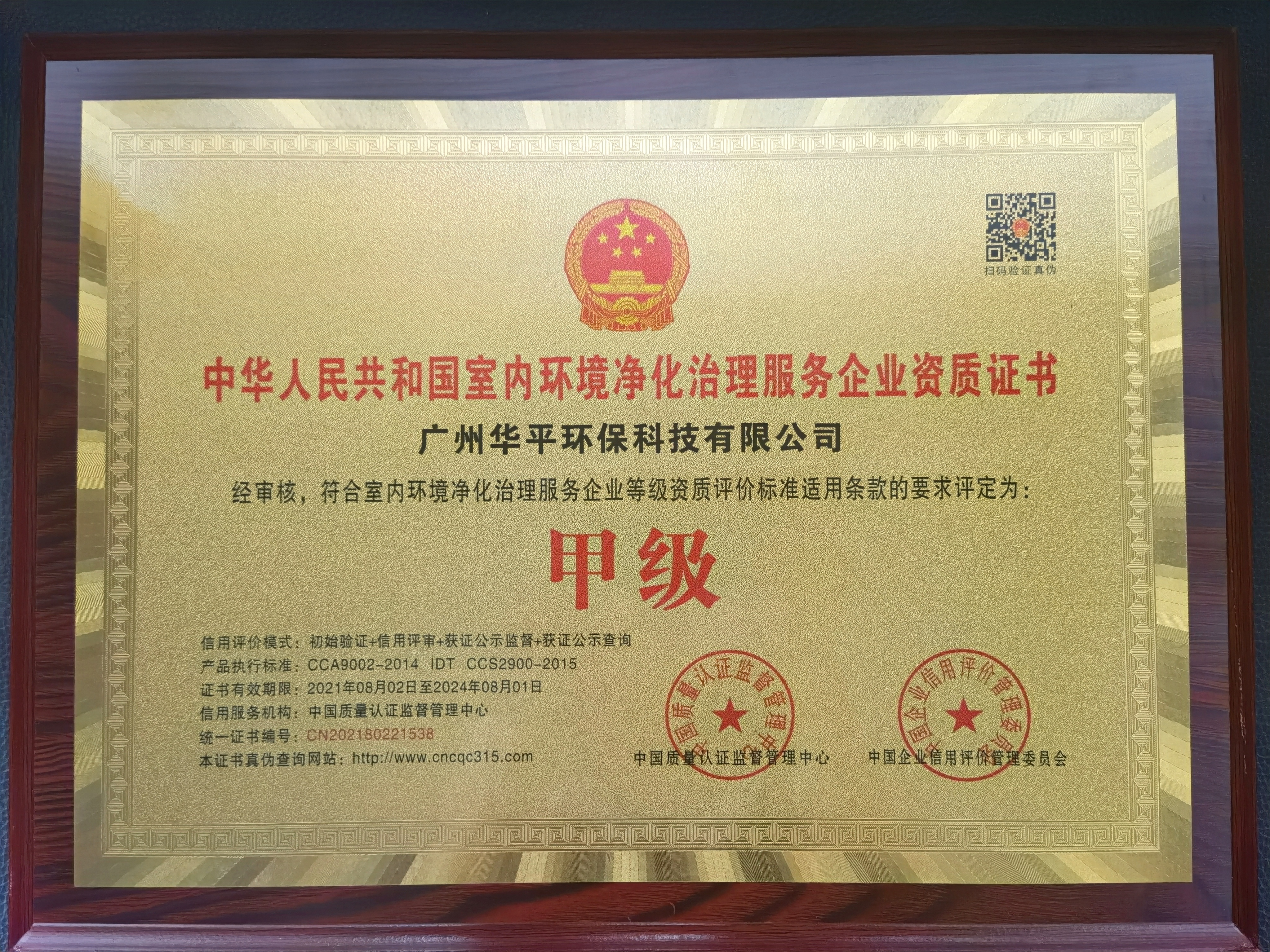 获得CQCS认证的甲级室内环境净化治理服务企业资质