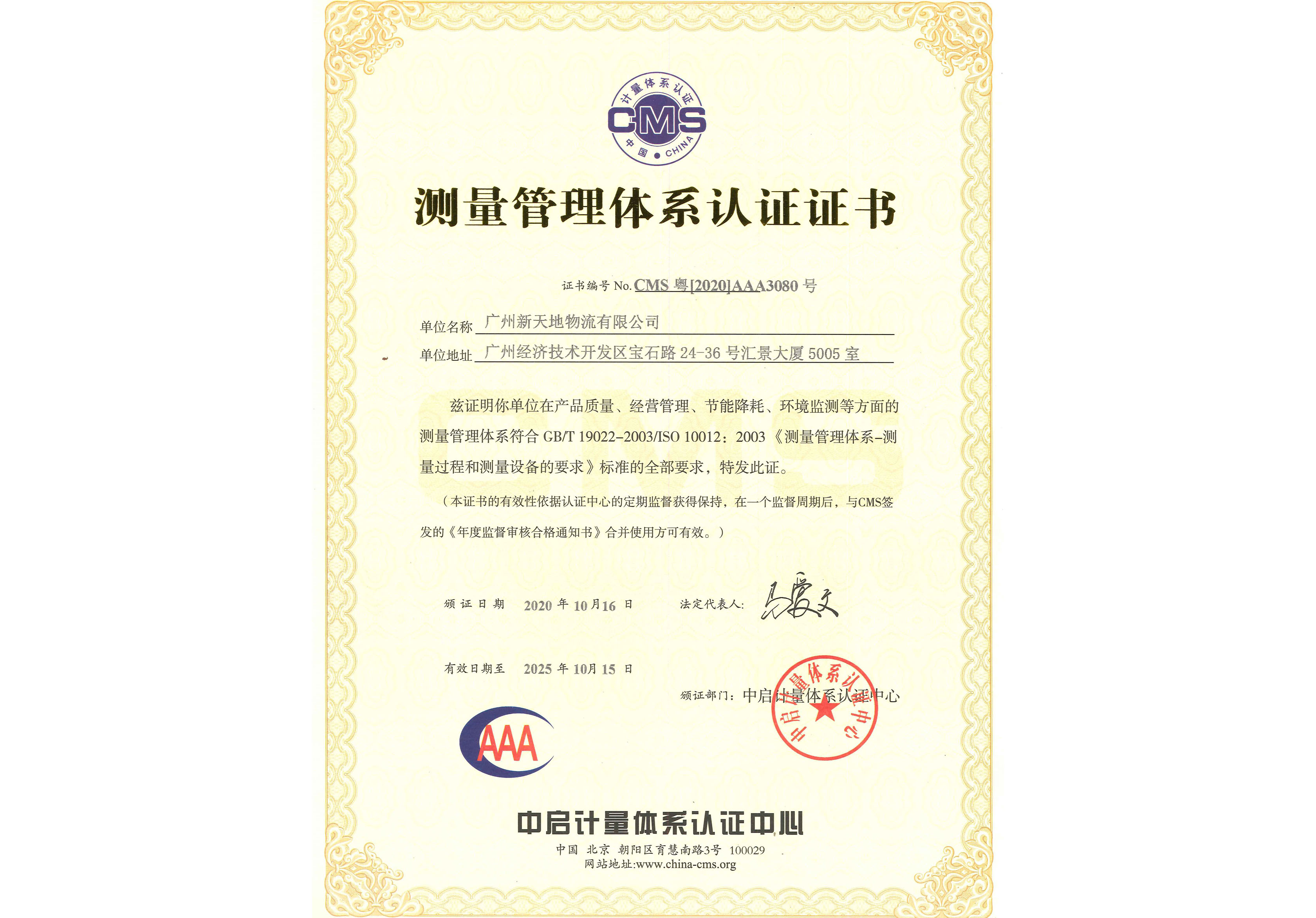 Yy易游供应链、新天地物流均荣获CMS测量管理体系认证的3A级企业